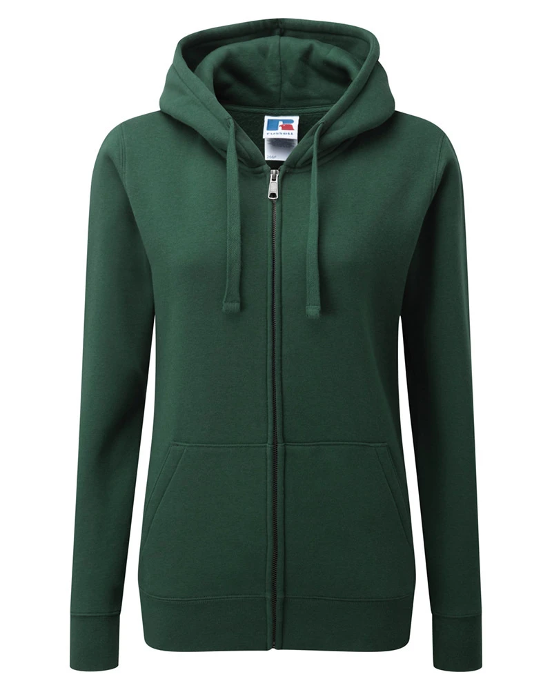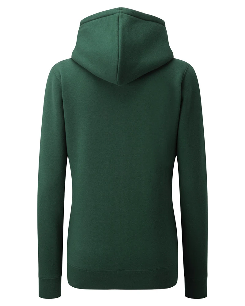 Gramáž: 280 g/m²; Materiál: 80% česaná, prstencově spřádaná bavlna, 20% polyester;100% bavlněná lícová příze (3vláknová konstrukce); Dvouvrstvá kapuce, ploché stahovací šňůrky, výztužná páska za krkem s nápletem "rybí kost", užší v ramenou s bočními švy, skrytý kovový YKK zip (antické stříbro) pro snadnější dekoraci, přístup k MP3 sluchátkům, 2 přední kapsy, průramky, manžety a lem se skrytými švy, moderní dámský střih; Certifikáty: STANDARD 100 by OEKO-TEX®; WRAP