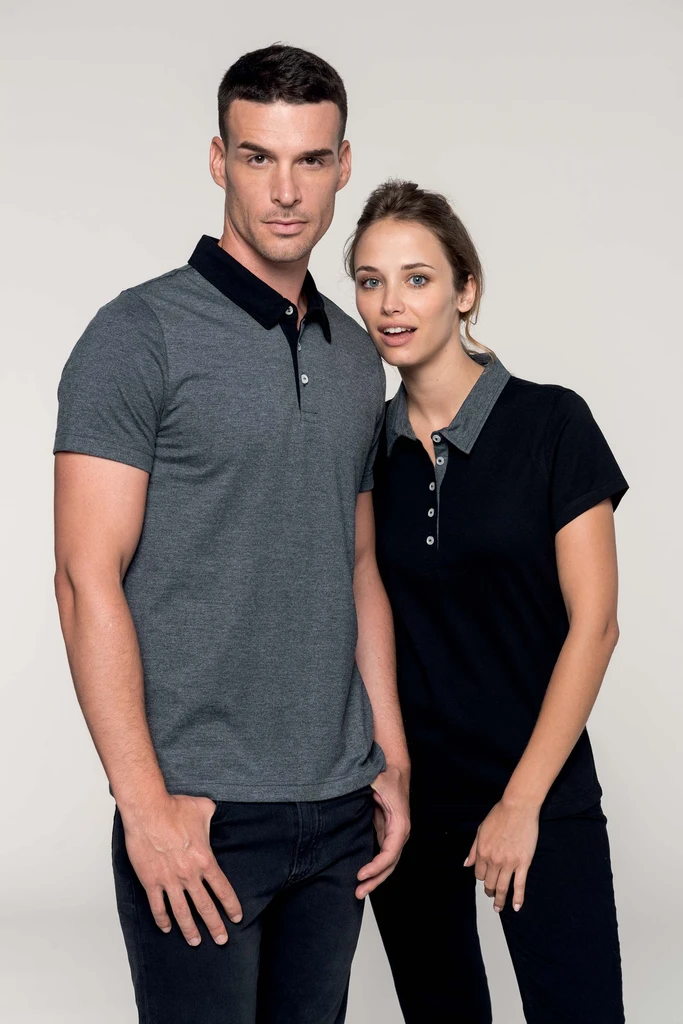 Kontrastní žebrování na límečku, zapínání na 5 perleťových knoflíků, vnitřek légy v kontrastní barvě, dvojité prošití manžet a spodního lemu.