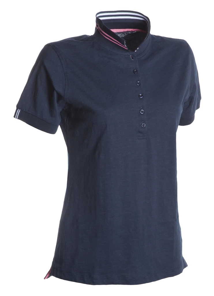 Krátký rukáv, zapínání na 6 knoflíčků - ve stejné barvě jako polokošile, límeček s kontrastními pruhy, na límečku a manžetách žebrované lemy, výztužná páska za krkem, boční rozparky