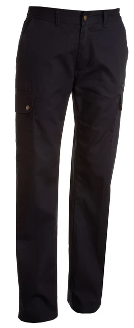 Letní kalhoty, elastické řasení na bocích, poutka na pásek, zapínání na zip a knoflík, 2 přední kapsy, 2 boční kapsy s klopou, na levé nohavici kapsa na zip, 2 zadní kapsy na knoflík