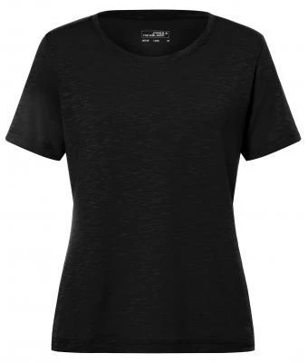 Funkční materiál vhodný pro volný čas a sport, prodyšný rychleschnoucí a vlhkost regulující materiál, elastický jednoduchý úplet, výztužná páska za krkem, kulatý výstřih, lehce pasovaný střih.