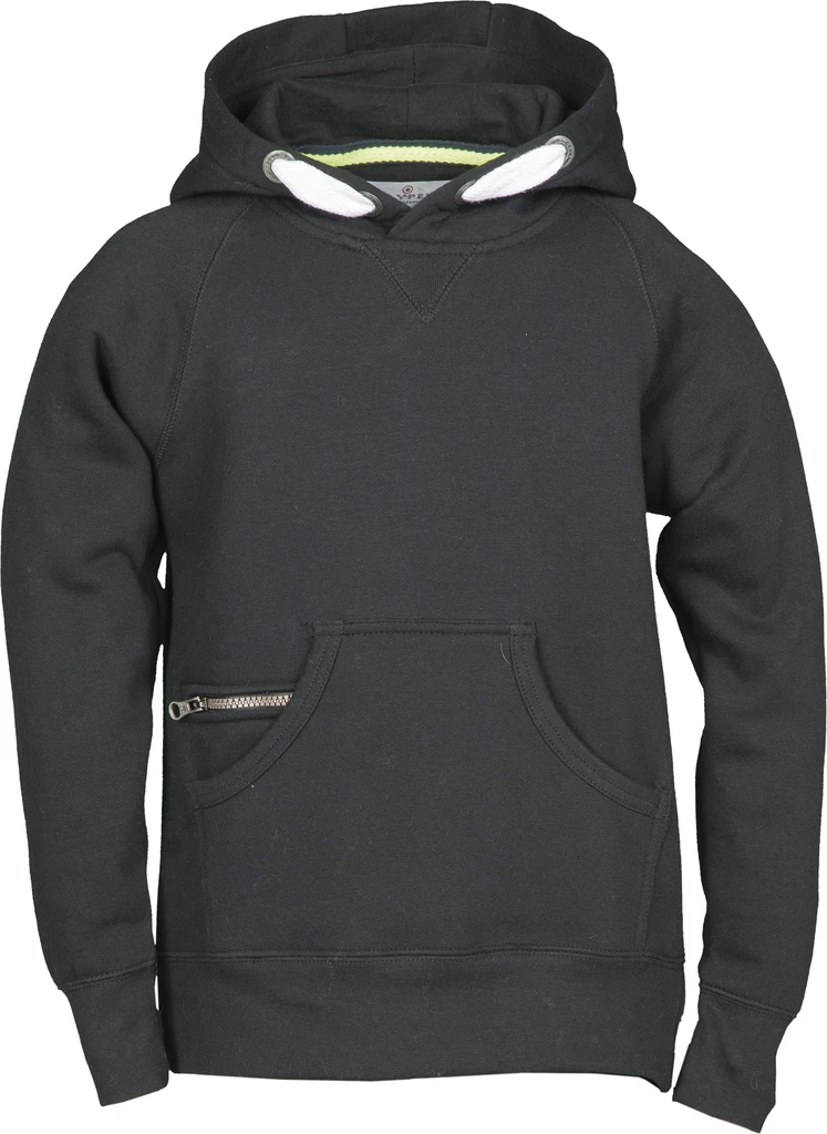 Dvojité švy, kapuce, dvojitá kovová očka na kapuci, bílá stahovací šňůrka, raglánové rukávy, dekorativní prošití do "V" pod výstřihem, klokaní kapsa, malá kapsa na zip, elastické manžety a spodní lem, vyztužené švy