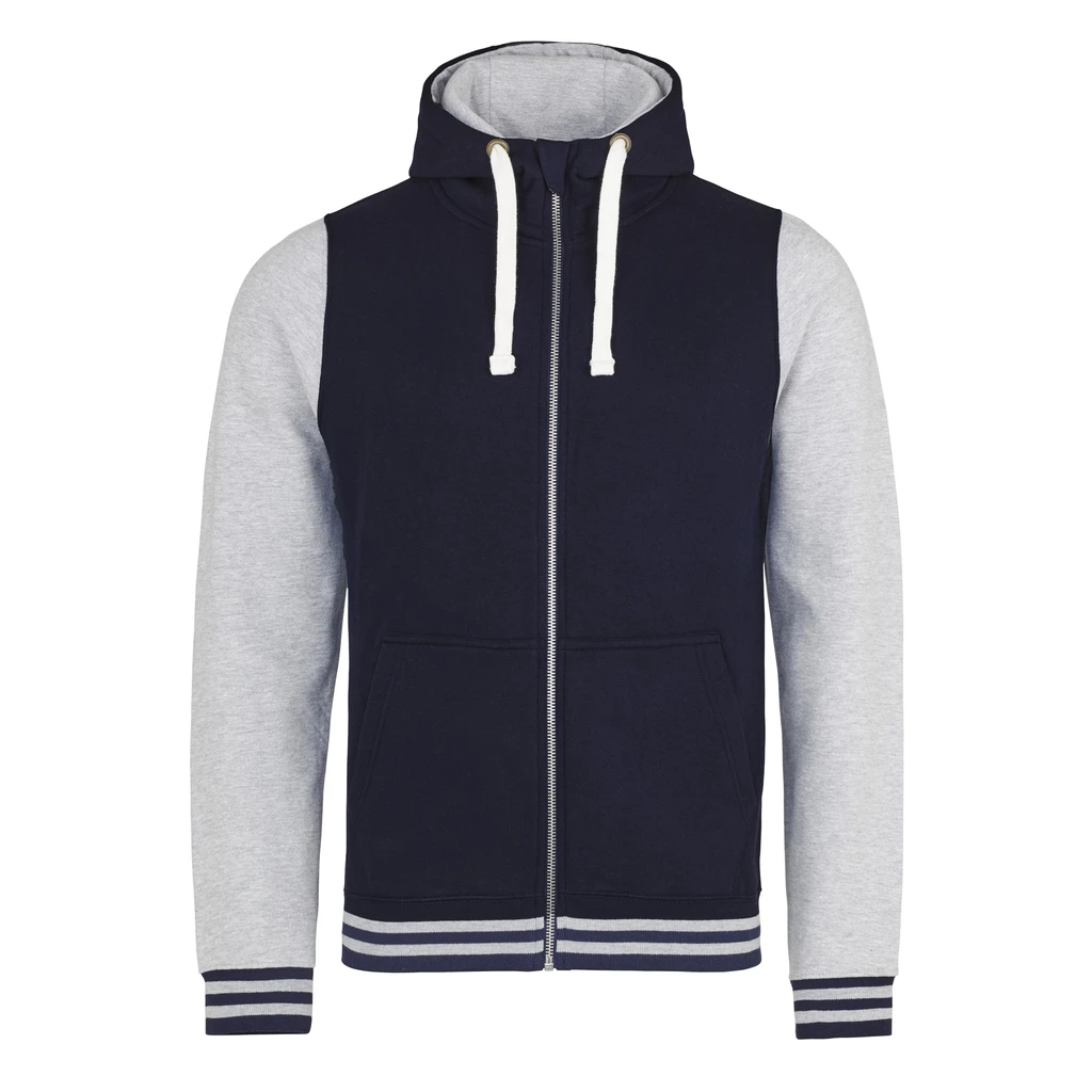 YKK zip po celé délce, kapuce ze tří panelů a s vnitřní kontrastní barvou, kontrastní rukávy, žádné šňůrky (splňující EU regulace), klokaní kapsa se skrytým vývodem na sluchátka, pletené pruhované manžety a spodní lem, jednoduchá změna značky, ideální povrch pro potisk.