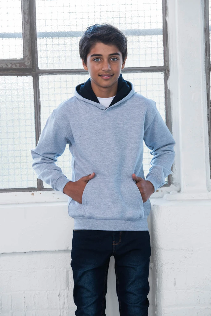 Dvojité prošití detailů, kapuce z dvojité vrstvy látky, vnitřek kapuce v kontrastní barvě, žádné šňůrky (splňující EU regulace), klokaní kapsa se skrytým vývodem na sluchátka, žebrované manžety a spodní lem, jednoduchá změna značky, ideální povrch pro potisk.