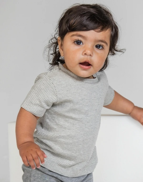 Jemná a pružná látka, pruhovaný vzor, kulatý výstřih s výstužnou páskou, 2 cvočky na stranách výstřihu, dvojitě prošitý lem, lehce odstranitelný štítek pro změnu značky.