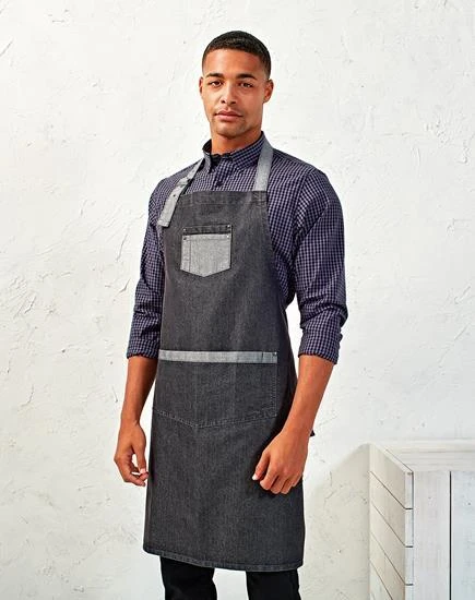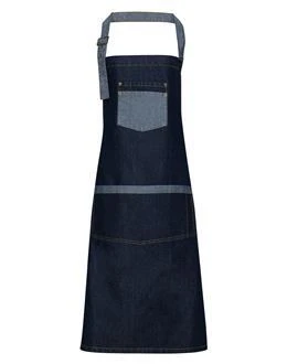 Tato zástěra s náprsenkou, která je svérázným doplňkem k džínové řadě, dodává 'průmyslově-elegantní' pocit při obsluze s velkými kovovými očky, které zajišťují poutka na místě. Na spodní straně kontrastní lem na kapsách a zavazování pro skvělý oboustranný efekt. Tým s PR128 „Domain“ pasovou zástěrou pro doplňující styl.