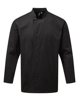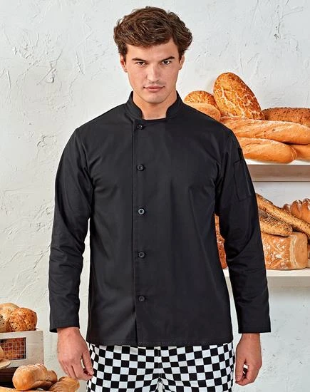 Odolný kuchařský rondon s dlouhým rukávem, který se zapíná na pravé straně těla pomocí pěti pryskyřicových knoflíků s dlouhou životností. Na levém horním rukávu je praktická dvojitá kapsa na pero. S límcem, je k dispozici v černé a bílé a nabízí skvělou hodnotu za peníze.