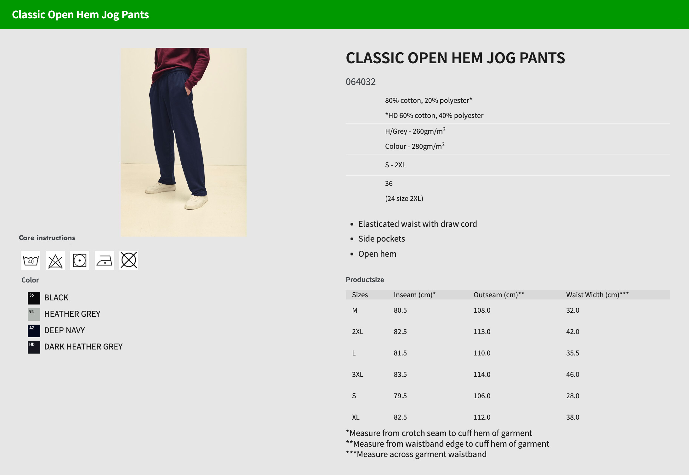 Materiál: 80% bavlna, 20% polyester (HD 60% bavlna, 40% polyester); Gramáž: H/Grey - 260g/m² (barevná - 280g/m²); Elastický pas se stahovací šňůrkou, boční kapsy, otevřený lem; Certificates: STANDARD 100 by OEKO-TEX®; WRAP