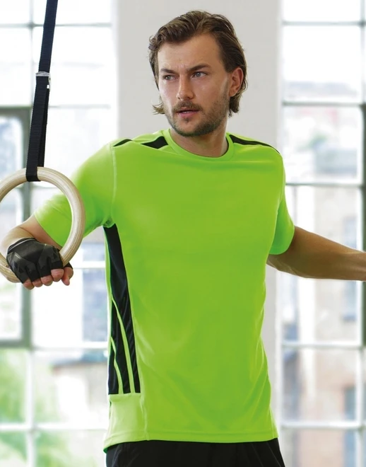 Odvádí vlhkost, kulatý výstřih, zaoblený zadní lem, štítek Gamegear®/Cooltex® natištěný vzadu na vnitřní straně, kontrastní boční a ramenní panely, rovný přední lem.