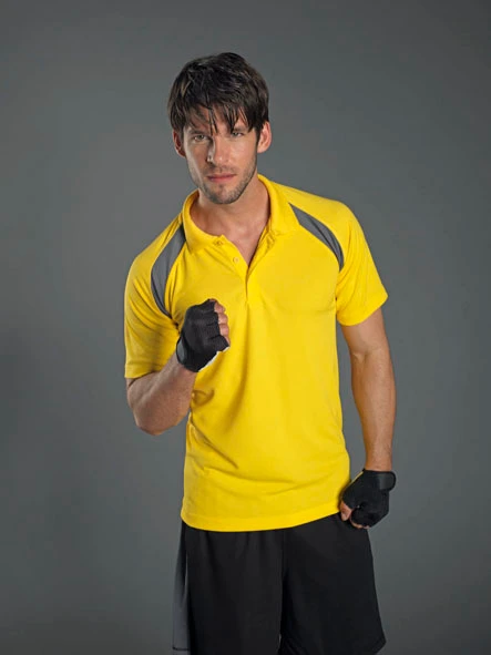 145 g/m² • 100% polyester • prodyšná látka • bez všité etikety • potisk na vnitřní straně košile • zpevňující pásek u krku • zapínání na 3 knoflíky • raglánové rukávy s kontrastními šedými pásky vpředu a vzadu • dvojité prošití rukávů a dolního lemu • boční švy s malými rozparky na koncích