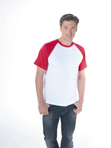 160 g/m² • 100% dopřádaná bavlna (Grey Heather: 85% bavlna, 15% viskóza) • raglánové rukávy a výstřih v kontrastní barvě • postranní švy