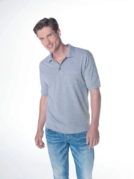 180 g/m² • 100% bavlna (Heather Grey: 85% bavlna, 15% viskóza) • piqué • zpevňující pásek za krkem • léga se 3 knoflíky a náprsní kapsa