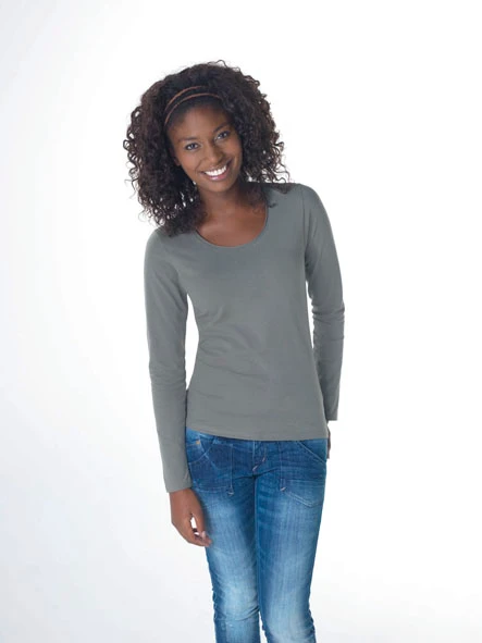 200 g/m² • 95% bavlna, 5% elastan • tričko s dlouhým rukávem s hedvábným povrchem • široký kulatý výstřih • výztužná páska za krkem • bez štítku za krkem • logo vytištěno za krkem • dámský vzhled • bez obruby u krku • postranní švy • dvojité prošití na rukávech a dolním lemu.
