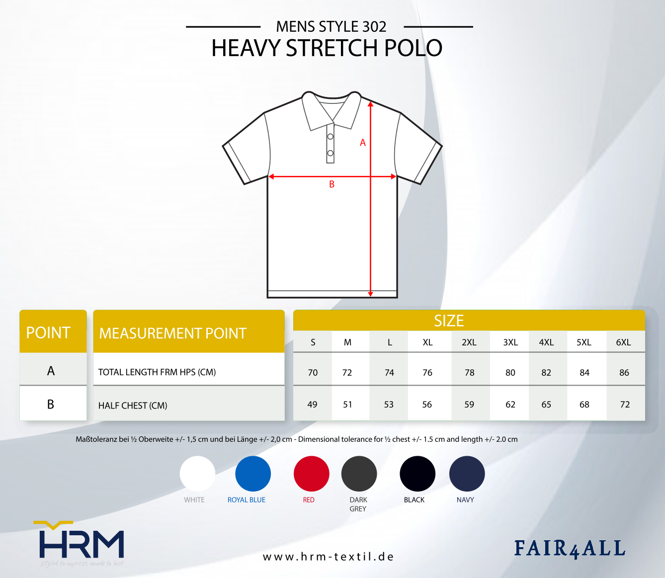 Naše pánské těžké strečové polokošile HRM jsou vyrobeny z velmi robustního, prstencového piké s jemnou síťovinou vyrobeného z 95 % bavlny a 5 % elastanu. Mají pohodlný módní střih a vyztužený průkrčník i límec a konce rukávů z žebrového úpletu 1x1. Tón v tónu 3-tlačítková léga dodává Heavy Stretch Polo Shirts vyvážený vzhled až do detailu. Vyztužené boční rozparky a nákrčník od ramene k rameni zajišťují skvělé pohodlí při nošení a dlouhou životnost. Polokošile Heavy Stretch, kromě tkaného vlajkového štítku Fair4All v levém bočním švu, jsou bez štítků a obzvláště snadno se udržují díky předúpravě proti srážení a žmolkování. Díky obsahu elastanu se zvyšuje komfort nošení a střih postavy. Jsou vhodné pro širokou škálu pracovních oděvů.