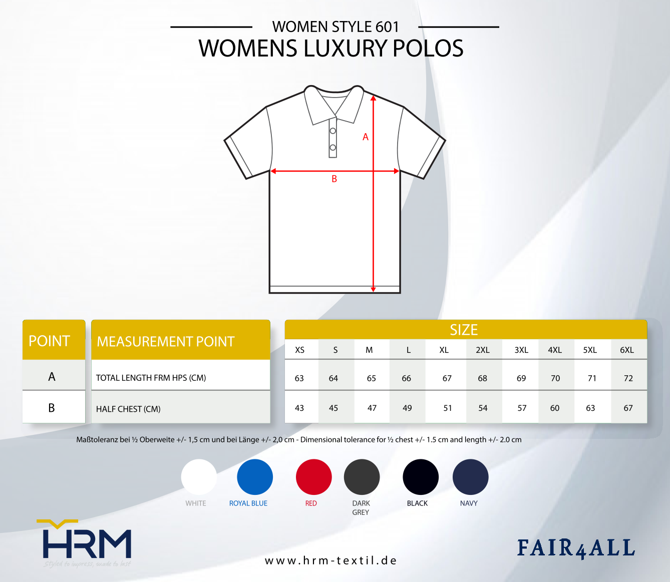 Naše dámské luxusní polokošile HRM s inovativním zpracováním límečku jsou vyrobeny z prstencového piké s jemnou síťovinou ze 100% bavlny a mají módní, postavě padnoucí střih s légou tón v tónu na 3 knoflíky s detaily HRM. Postranní rozparky vyztužené keprovým páskem a keprový nákrčník zajišťují skvělé pohodlí při nošení a dlouhou životnost. Lze je prát do 60°C a díky předúpravě proti smršťování a žmolkování se obzvláště snadno čistí i při vysokých a pravidelných pracích cyklech. Naše luxusní bavlněné polokošile jsou bez štítků, kromě tkaného štítku Fair4All v levém bočním švu.
