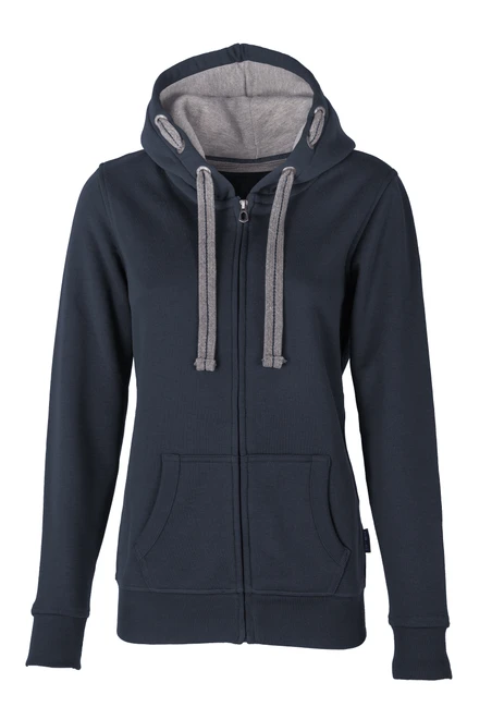 Dámské bundy s kapucí HRM jsou vyrobeny z nápadně měkké směsi 80 % bavlny a 20 % polyesteru. Speciálně navržené detaily, jako je kapuce s kontrastní podšívkou, 3 kovová očka HRM na každé straně, uprostřed vyšívaná plochá kontrastní šňůra a zip v tónu tónu s kovovým tahákem HRM jsou skutečným poutačem. Kapsy i pas mají zakončení žebrovým úpletem 2x2. Vyztužený barevně ladící nákrčník zvyšuje komfort nošení. Velmi hladká povrchová struktura zaručuje dobrou dokončovací schopnost. Bundy s kapucí jsou, kromě tkaného vlajkového štítku Fair4All v levém bočním švu, bez štítků. Jsou velmi univerzálně použitelné v chladném a větrném počasí.