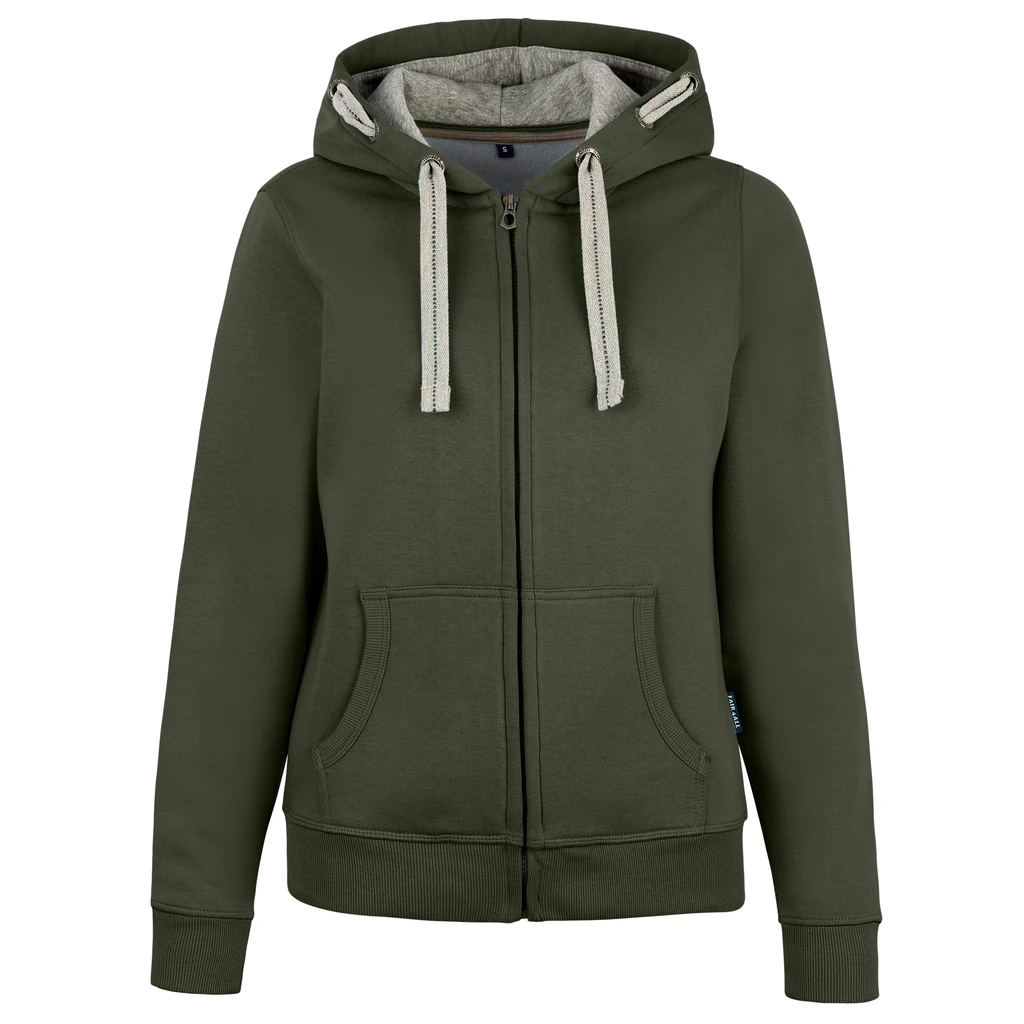 Dámské bundy s kapucí HRM jsou vyrobeny z nápadně měkké směsi 80 % bavlny a 20 % polyesteru. Speciálně navržené detaily, jako je kapuce s kontrastní podšívkou, 3 kovová očka HRM na každé straně, uprostřed vyšívaná plochá kontrastní šňůra a zip v tónu tónu s kovovým tahákem HRM jsou skutečným poutačem. Kapsy i pas mají zakončení žebrovým úpletem 2x2. Vyztužený barevně ladící nákrčník zvyšuje komfort nošení. Velmi hladká povrchová struktura zaručuje dobrou dokončovací schopnost. Bundy s kapucí jsou, kromě tkaného vlajkového štítku Fair4All v levém bočním švu, bez štítků. Jsou velmi univerzálně použitelné v chladném a větrném počasí.