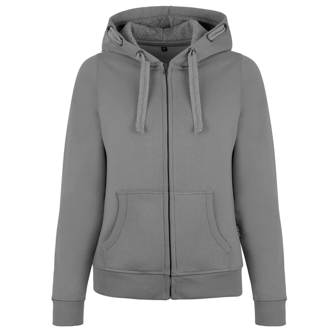 Dámské bundy s kapucí HRM jsou vyrobeny z nápadně měkké směsi 80 % bavlny a 20 % polyesteru. Speciálně navržené detaily, jako je kapuce s kontrastní podšívkou, 3 kovová očka HRM na každé straně, uprostřed vyšívaná plochá kontrastní šňůra a zip v tónu tónu s kovovým tahákem HRM jsou skutečným poutačem. Kapsy i pas mají zakončení žebrovým úpletem 2x2. Vyztužený barevně ladící nákrčník zvyšuje komfort nošení. Velmi hladká povrchová struktura zaručuje dobrou dokončovací schopnost. Bundy s kapucí jsou, kromě tkaného vlajkového štítku Fair4All v levém bočním švu, bez štítků. Jsou velmi univerzálně použitelné v chladném a větrném počasí.