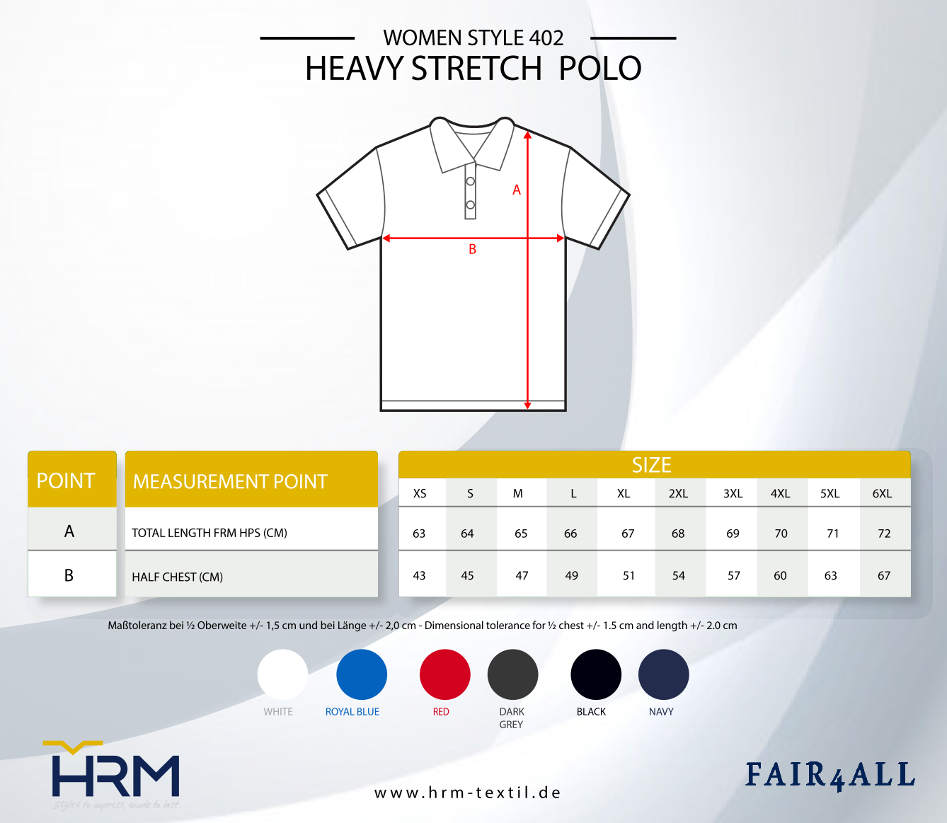 Naše dámské těžké strečové polokošile HRM jsou vyrobeny z velmi robustního, prstencového piké s jemnou síťovinou z 95 % bavlny a 5 % elastanu. Mají pohodlný módní střih a vyztužený průkrčník i límec a konce rukávů z žebrového úpletu 1x1. Tón v tónu 3-tlačítková léga dodává Heavy Stretch Polo Shirts vyvážený vzhled až do detailu. Vyztužené boční rozparky a nákrčník od ramene k rameni zajišťují skvělé pohodlí při nošení a dlouhou životnost. Polokošile Heavy Stretch, kromě tkaného vlajkového štítku Fair4All v levém bočním švu, jsou bez štítků a obzvláště snadno se udržují díky předúpravě proti srážení a žmolkování. Díky obsahu elastanu se zvyšuje komfort nošení a střih postavy. Jsou vhodné pro širokou škálu pracovních oděvů.