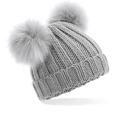 Štítek TearAway pro snadnou změnu značky, přepychový pletený žebrovaný úplet, luxusní bambule z umělé kožešiny, neodnímatelné bambulky pro větší bezpečnost, manžetový design pro optimální dekoraci