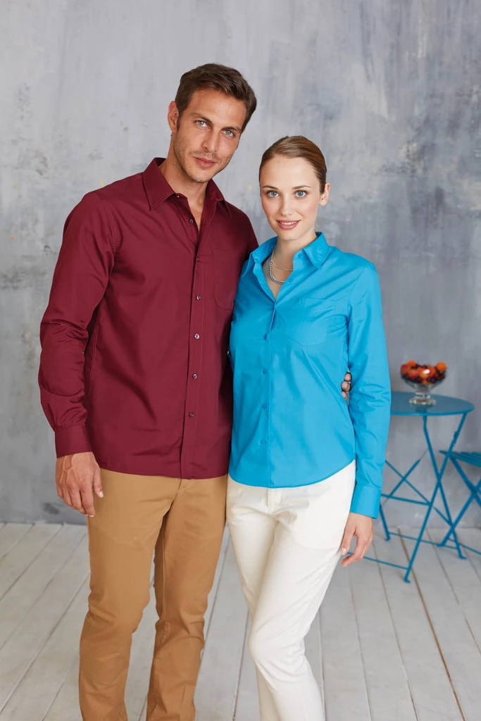 Materiál nenáročný na údržbu, nezpevněný límeček, náprsní kapsa nalevo, knoflíčky ve stejné barvě jako košile, jeden náhradní knoflíček, tvarovaný lem.