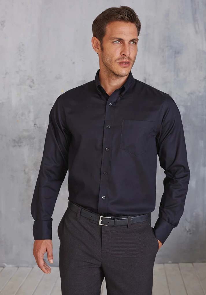 Nežehlený materiál, s knoflíky na límečku, knoflíčky ve stejné barvě jako košile, náprsní kapsa nalevo, zpevněné švy, 2 náhradní knoflíčky, nastavitelné manžety, tvarovaný lem.
