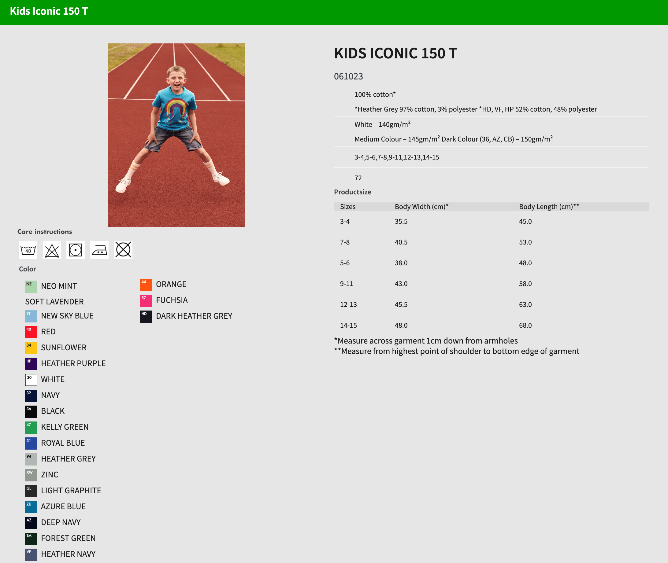 Materiál: 100% bavlna (Heather Grey 97% bavlna, 3% polyester; HD, VF, HP 52% bavlna, 48% polyester); Gramáž: Bílé & Heather Grey – 140g/m² (barevné – 150g/m²); 100% česaná, prstencová bavlna, měkká do dotek, mírně vyštíhlený střih, kulatý výstřih s úzkým žebrováním 1x1, páska na zátylku, nový odtrhávací štítek na zadní straně krku; Certifikáty: STANDARD 100 by OEKO-TEX®; WRAP
