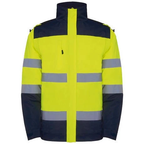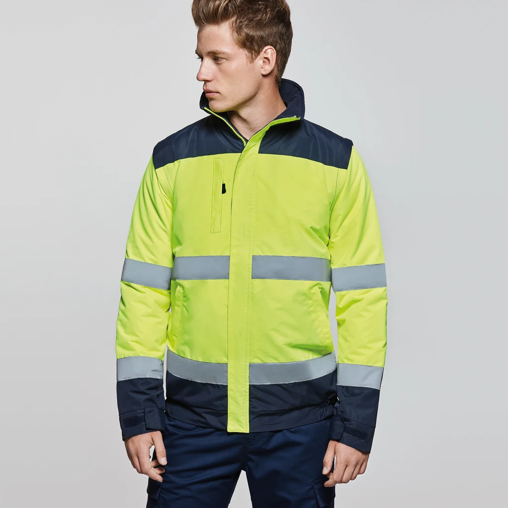 Reflexní pruhy na těle a rukávech, kapuce s fluorescenčním lemem se zarážkami, náprsní kapsa na zip, 2 mírně šikmé přední kapsy, elastický pas, nastavitelné manžety na suchý zip, reflexní celopropínací zip s patkou, vnitřní kapsa na hrudi, vnitřní zip pro snadný přístup na tisk nebo výšivku, odnímatelné rukávy, Certifikace CE podle norem: EN ISO 13688:2013 a UNE-EN ISO 20471:2013, vysoká viditelnost, vodě a větruodolný materiál.