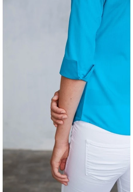 Materiál nenáročný na údržbu, nezpevněný límeček, náprsní kapsa nalevo, knoflíčky ve stejné barvě jako košile, jeden náhradní knoflíček, tvarovaný lem.
