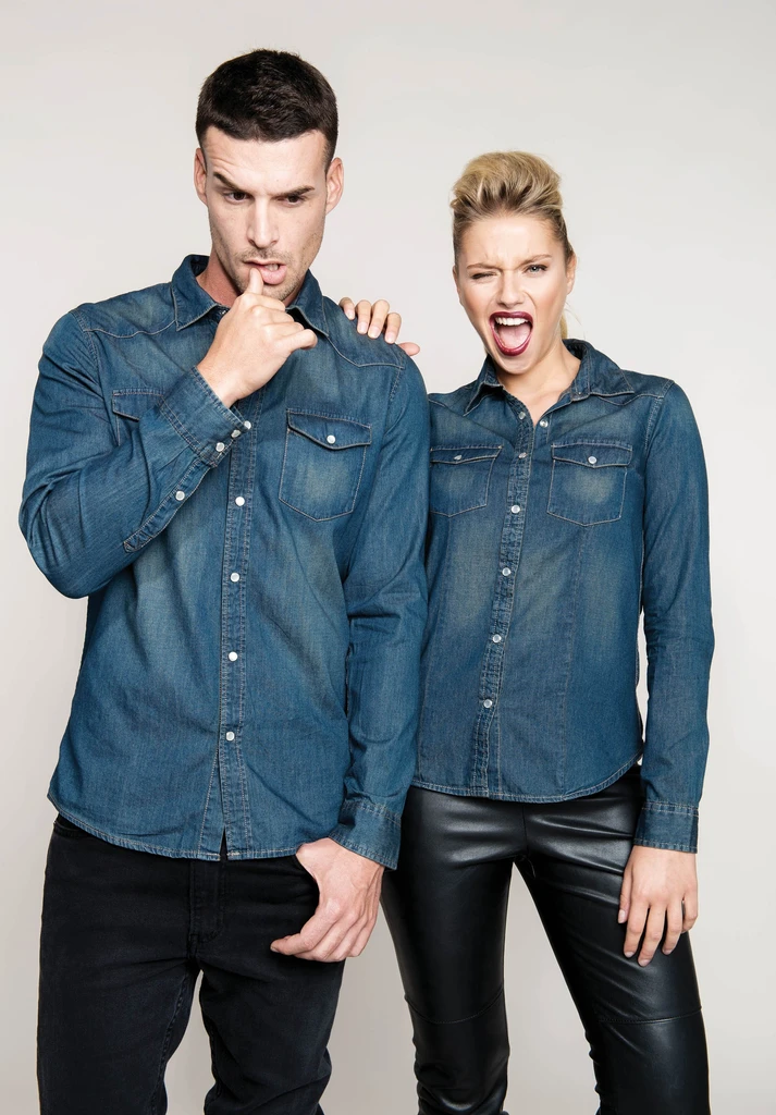 Stylové zapínání na cvočky, 2 náprsní kapsy s klopou, cvočky na manžetách, vypasovaný střih.