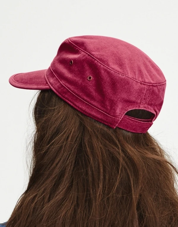 Plochá nevyztužená kšiltovka, zaoblený kšilt, 2 obšité otvory na každé straně, zapínání na suchý zip.