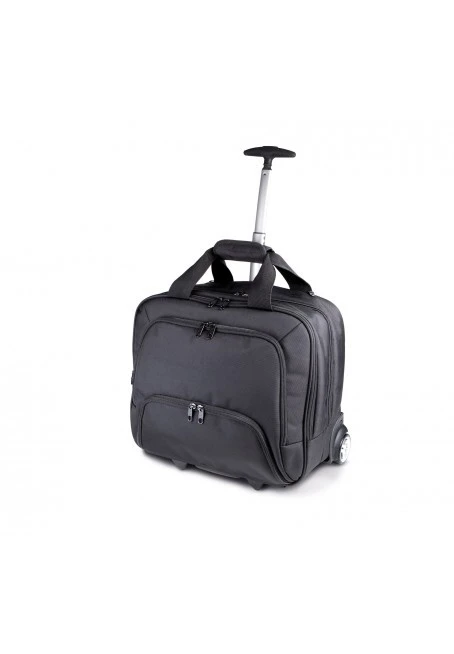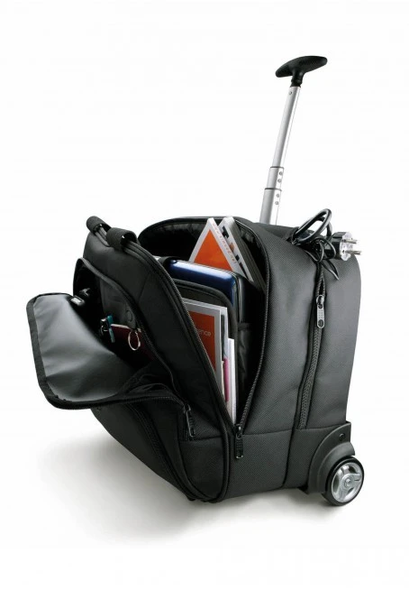 Zakřivená rukojeť z eloxovaného hliníku. 2 hlavní přihrádky - jedna s držákem na notebook až do velikosti 17", druhá na doklady a oblečení pro noční cestování, 2 přední kapsy, na zadní straně pás, zipy SBS.