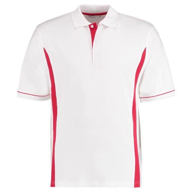 Kontrastní výztužná páska na límci, léga s 3 knoflíky, na rukávech proužky v kontrastní barvě, kontrastní vložky na bocích, boční rozparky zesílené látkou s úpletem "rybí kostra", dvojitý šev na spodním lemu.