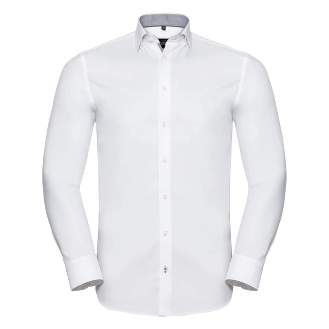 Gramáž: 130 g/m² (White: 125 g/m²); Materiál: 84% bavlna, 16% polyester; Pánská košile s kontrastním proužkem; Speciální úprava "Easy Care". Límeček lze připnout dole pomocí knoflíčků, kontrastní barva na vnitřní straně límce a manžet, kontrastní barva na spodní straně légy na knoflíky, manžety na 2 knoflíky, zaoblený spodní lem, přiléhavý střih, zužující švy na zádech; Certifikáty: STANDARD 100 by OEKO-TEX®; WRAP