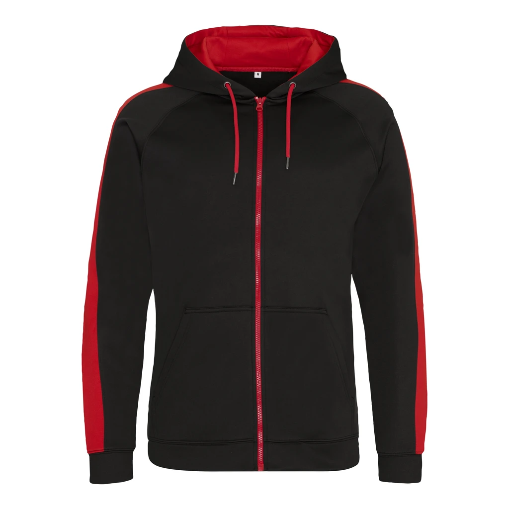 Sportovní střih, zip po celé délce, dvojité prošití detailů, raglánové rukávy s kontrastními panely, kontrastní stahovací šňůrka, kapuce ze tří panelů - kontrastní podšívka, klokaní kapsa s vývodem na sluchátka, jednoduchá změna značky.