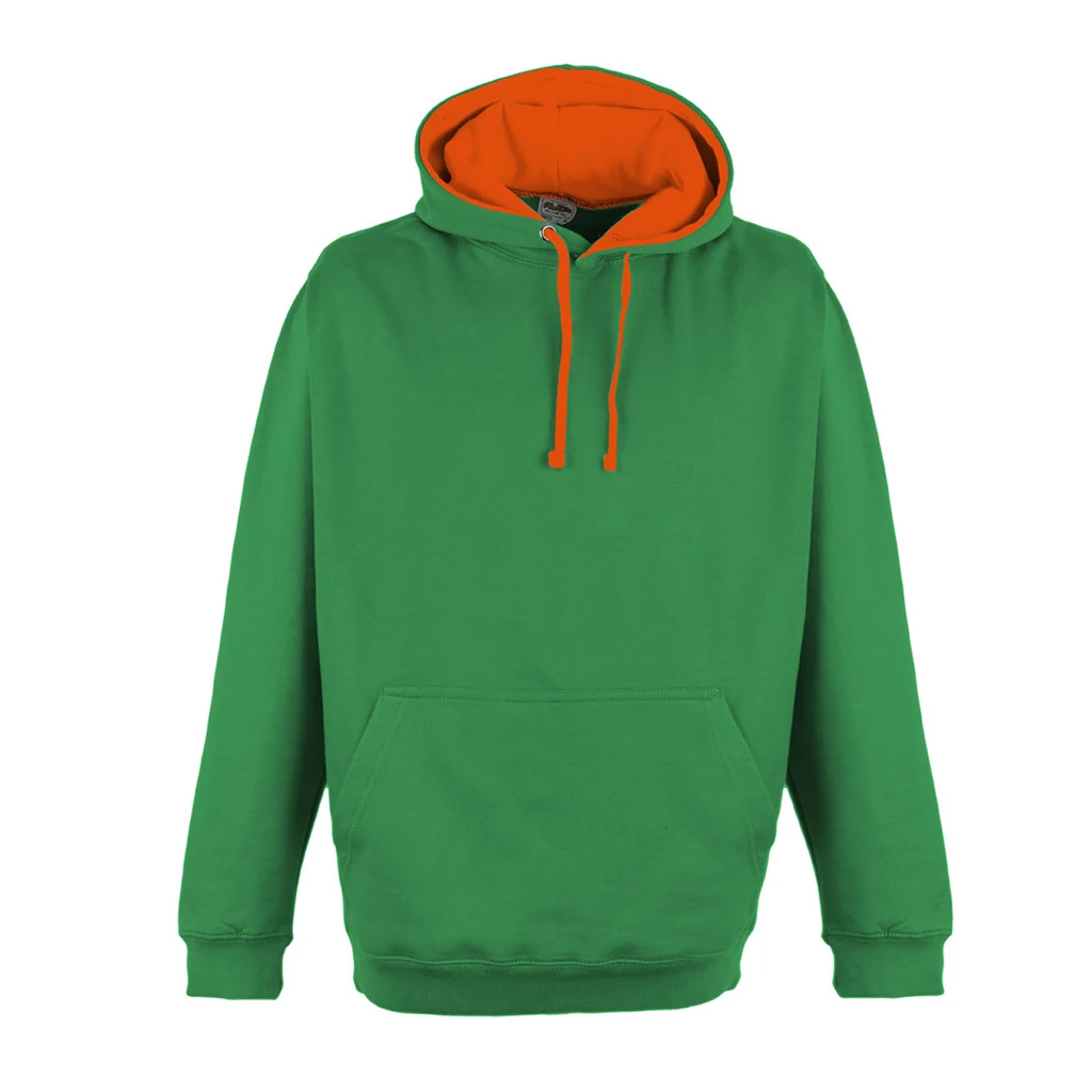 Dvojité prošití detailů, kapuce z dvojité vrstvy látky, vnitřek kapuce v kontrastní barvě, ploché šňůrky v kontrastní barvě, klokaní kapsa se skrytým vývodem na sluchátka, žebrované manžety a spodní lem, jednoduchá změna značky, ideální povrch pro potisk.
