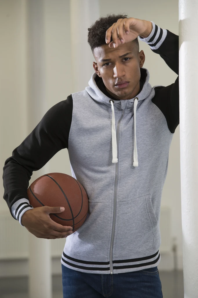Zip po celé délce, kapuce ze tří panelů a s vnitřní kontrastní barvou, kontrastní rukávy, ploché šňůrky v krémové barvě, klokaní kapsa se skrytým vývodem na sluchátka, pletené pruhované manžety a spodní lem, jednoduchá změna značky, ideální povrch pro potisk.