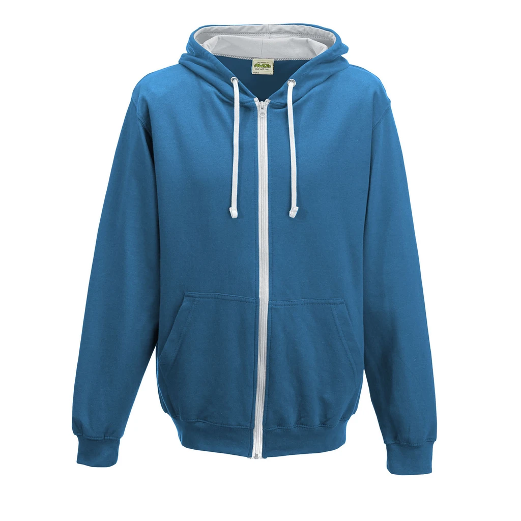 Kontrastní plastový zip po celé délce, dvojité prošití detailů, kapuce z dvojité vrstvy látky, vnitřek kapuce v kontrastní barvě, šňůrky v kontrastní barvě, klokaní kapsa se skrytým vývodem na sluchátka, žebrované manžety a spodní lem, jednoduchá změna značky, ideální povrch pro potisk, unisex.