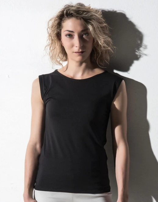 Široký výstřih s malým lemováním ze stejné látky, zarolované rukávy přišité ve výši ramen, postranní švy, dvojité prošití spodního lemu, medium střih, neutrální štítek za krkem.