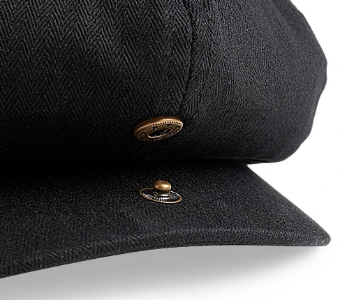 Štítek TearAway pro snadnou změnu značky, tradiční styl, tkanina se vzorem s rybí kostí, celoprošitá podšívka, kšilt na zapínání na patentky, k dispozici ve dvou velikostech - S/M a L/XL