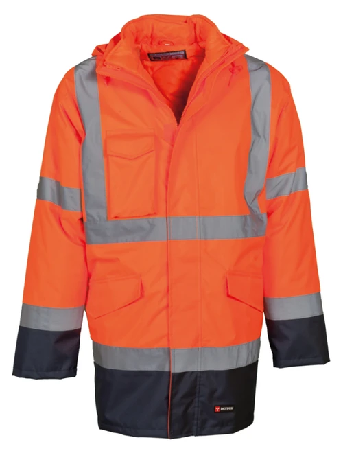 Vysoká viditelnost, nepodšitá vnější bunda, po celé délce zip, skrytá kapuce, 2 přední kapsy s klopou, kapsa na mobilní telefon, vnitřní kapsa na suchý zip. Oddělitelná vnitřní bunda, vycpaná, odnímatelné rukávy, elastické žebrované manžety, tepelně utěsněné švy, dvě přední kapsy se zapínáním na zip, vnitřní kapsa se zipem