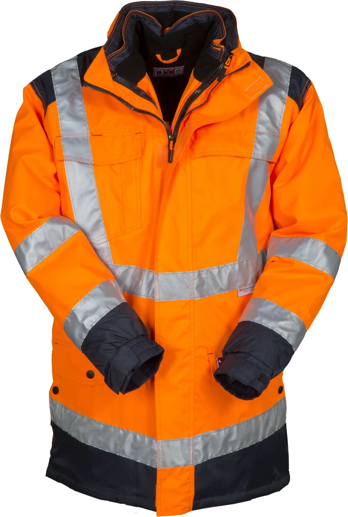 Vysoká viditelnost, 3M reflexní pruhy, nepodšitá vnější bunda, po celé délce zip, kovový jezdec, přes zip klopa na suchý zip, kapuci lze skrýt do límce nebo ji odepnout, stahovací šňůrka v kapuci, elastický pas, nastavitelné manžety, 4 přední prostorné kapsy (2 na zip), náprsní kapsa s držákem na pero, odnímatelná jmenovka, kapsa se skrytým zipem, uvnitř límce fleece, vnitřní bunda s odnímatelnými rukávy, vatová vycpávka, tepelně lepené švy
