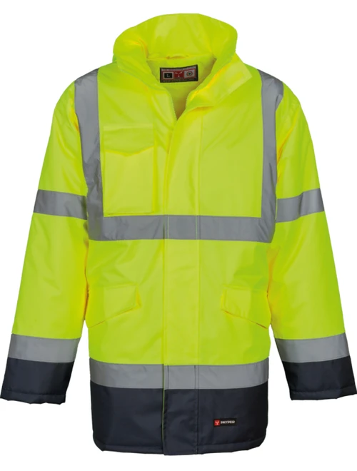 Vysoká viditelnost, reflexní pásky, zip po celé délce, přes zip klopa, kapuci lze schovat do límce, elastické žebrované manžety, 2 přední kapsy s klopou, kapsa na mobilní telefon, držák na jmenovku, vatová vycpávka, vnitřní kapsa na suchá zip, tepelně lepené švy