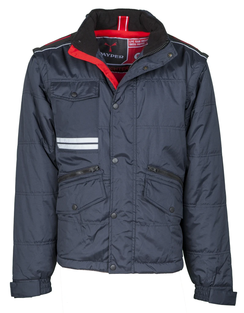 Odnímatelné rukávy, 8 mm široký plastový zip po celé délce, kovový jezdec, klopa po celé délce s plastovými knoflíky, 2 vnější kapsy se speciálním zavíracím systémem, 2 kapsy na zip, šikmé kapsy pro jednodušší přístup, kapsa na hrudi na mobilní telefon, reflexní proužky, vatová vycpávka, podšívka z fleecu v kontrastní barvě