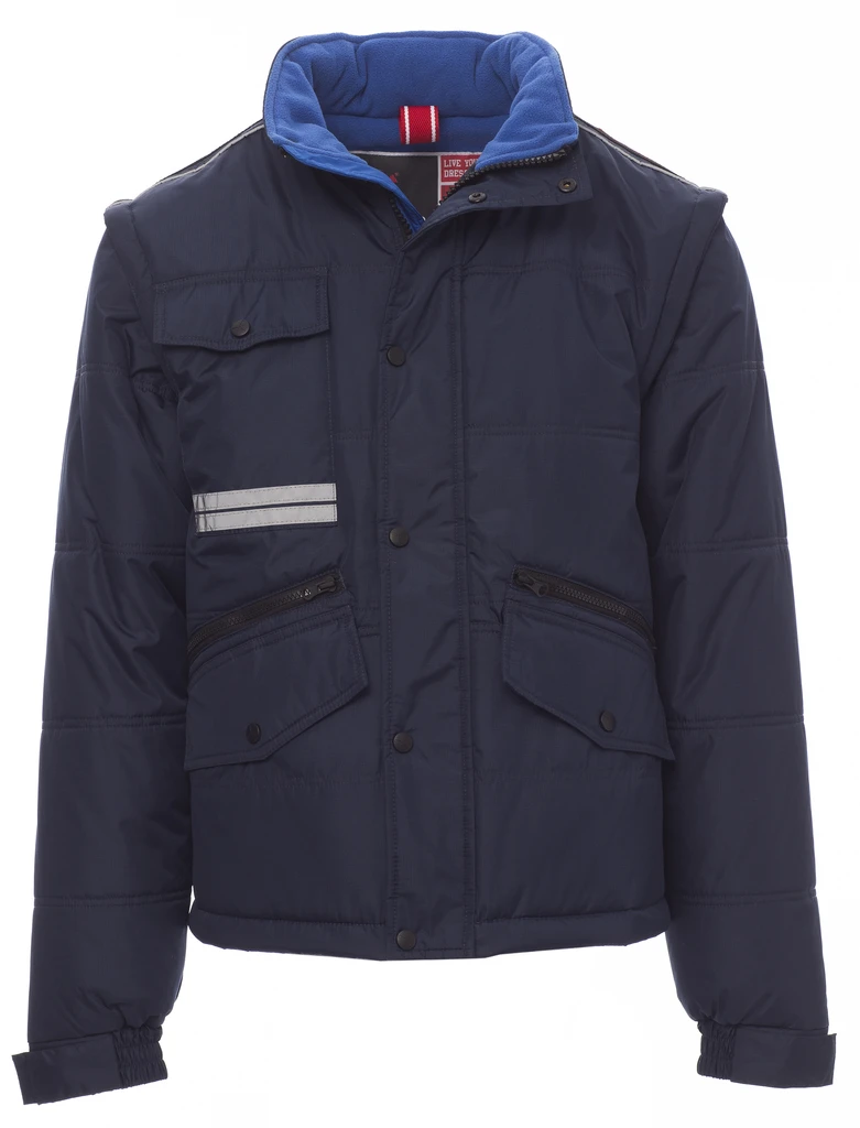 Odnímatelné rukávy, 8 mm široký plastový zip po celé délce, kovový jezdec, klopa po celé délce s plastovými knoflíky, 2 vnější kapsy se speciálním zavíracím systémem, 2 kapsy na zip, šikmé kapsy pro jednodušší přístup, kapsa na hrudi na mobilní telefon, reflexní proužky, vatová vycpávka, podšívka z fleecu v kontrastní barvě