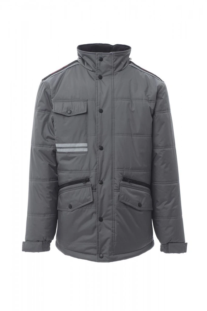 Lehká bunda ve 3/4 délce, zapínání na plastový zip (8mm) s kovovým jezdcem, který je skrytý pod klopou s plastovými knoflíky. Tvarovaná zadní část s kapucí v límci, dvě vnější kapsy "LOCK SYSTEM", dvě kapsy na zip, šikmé kapsy pro snadný přístup, jedna kapsa na hrudi na smartphone a upínací kroužek na jmenovku, reflexní pruhy na kapse a na zádech. Vnitřní strana zateplená, s kontrastním flísovým lemem na zádech a límci, jedna vnitřní kapsa, vnitřní zip pro snadnější potisk a vyšívání