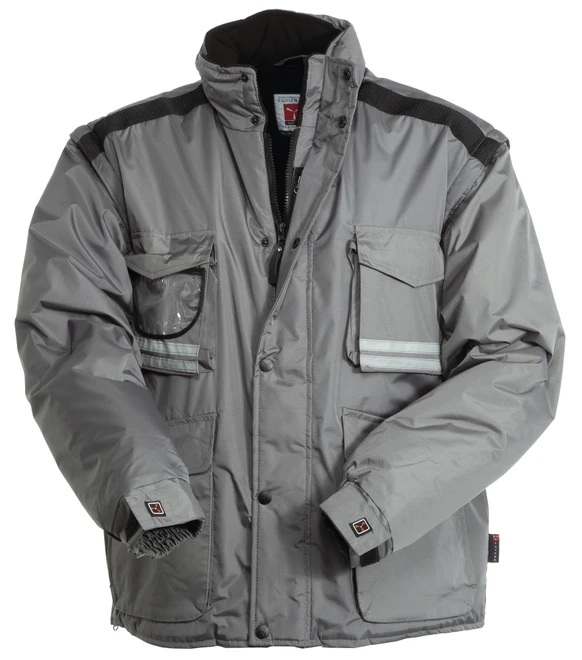 8 mm široký plastový zip po celé délce, kovový jezdec, klopa po celé délce s plastovými knoflíky, odnímatelné rukávy, nastavitelné manžety, kapuce schovaná v límci, vpředu i vzadu reflexní pruhy, boční ventilační otvor na zip, 5 vnějších kapes, vatová vycpávka, podšívka z microfleecu