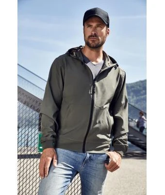 Kapuce se stahovací šňůrkou, dvouvrstvý softshell s kontrastní podšívkou ze síťoviny, elastický pas a manžety rukávů, odolnost vůči vodě a nečistotám díky BIONIC-FINISH®ECO, našitá klokaní kapsa na zip, vnitřní kapsa, zip YKK po celé délce.