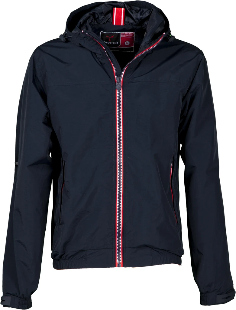 Po celé délce 8 mm široký plastový kontrastní zip, kapuce se stahovací šňůrkou a dvojitými švy, elastické manžety a spodní lem, 2 vnější kapsy na skrytý zip, bez vycpávky, síťovaná podšívka, vnitřní kapsa na mobilní telefon s vývodem na sluchátka