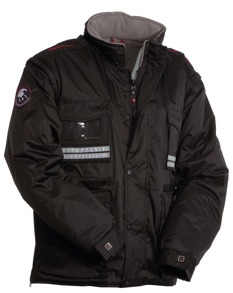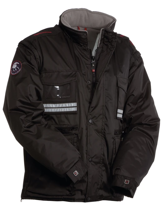8 mm široký plastový zip po celé délce, kovový jezdec, klopa s cvoky po celé délce, odepínací rukávy, odepínací kapuce, nastavitelné manžety, reflexní proužky vpředu i vzadu, boční ventilační otvory na zip, 9 vnějších kapes - 2 se speciálním zavíracím systémem, 2 na zip a s vyztuženým vnitřkem, 1 kapsa průhledná, vatová vycpávka, podšívka na límci z microfleecu